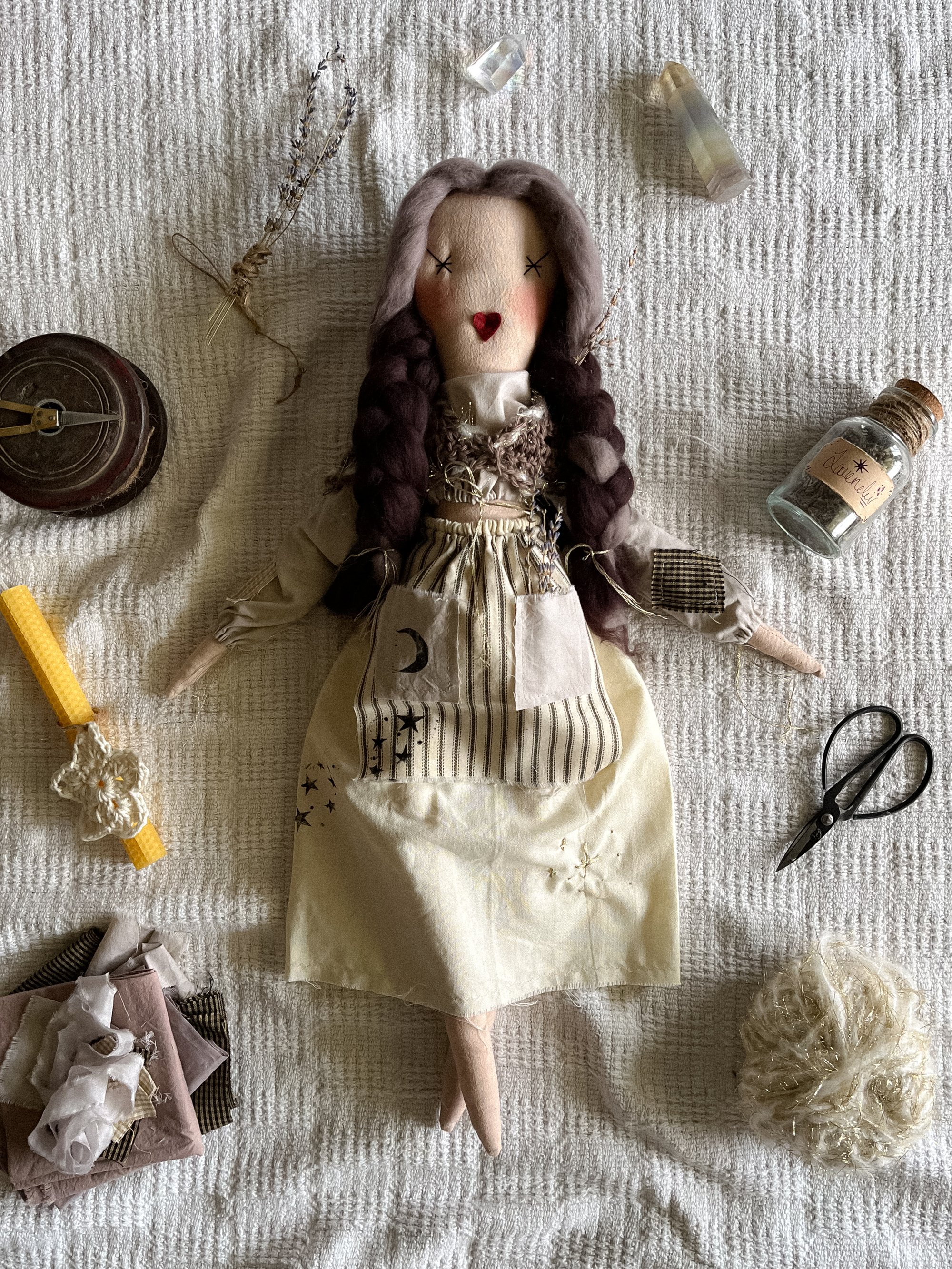 Lune is a doll of still nights and soft imaginings: of lavender-sweet air, closed eyes, and the space where dreams and stories meet. Whether placed on your shelf, altar, or bedside table, she brings a gentle, restful presence to any space.